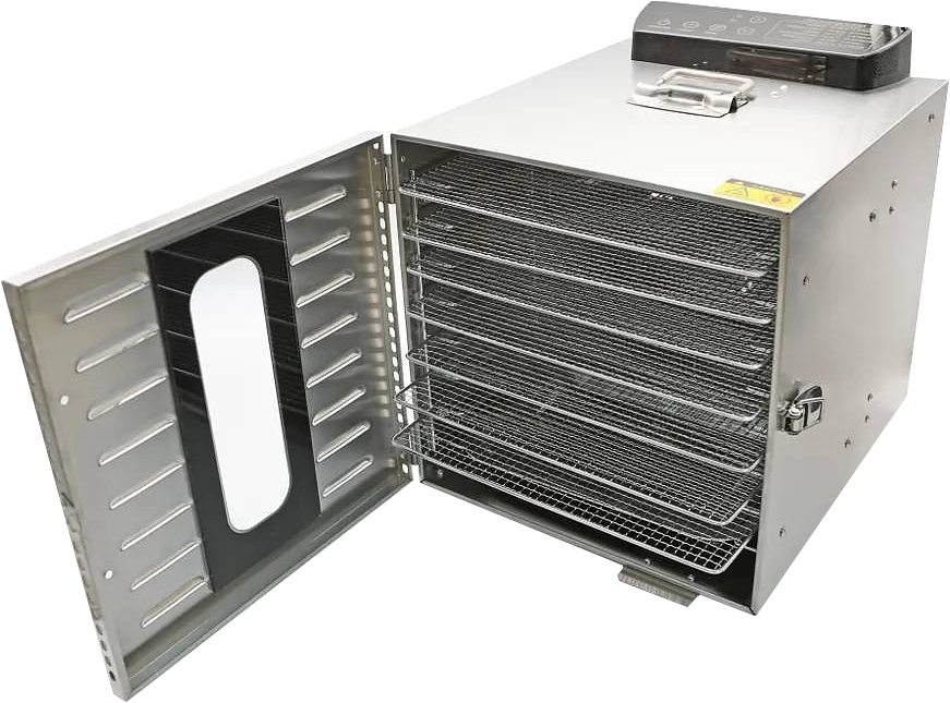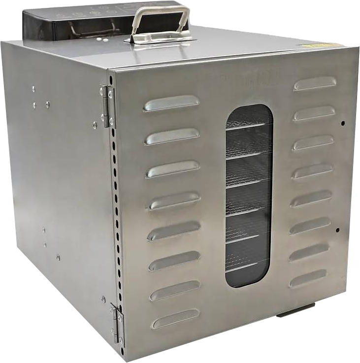 Благодаря большой вместимости можно сушить множество нарезанных продуктов одновременно или работать с крупными кусками без измельчения. Широкие возможности настройки температурного режима позволяют создать идеальный микроклимат для каждого типа продуктов и сохранить максимальное количество полезных веществ в готовом блюде. Корпус выполнен из нержавеющей стали.