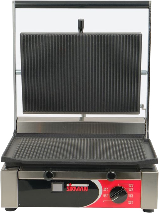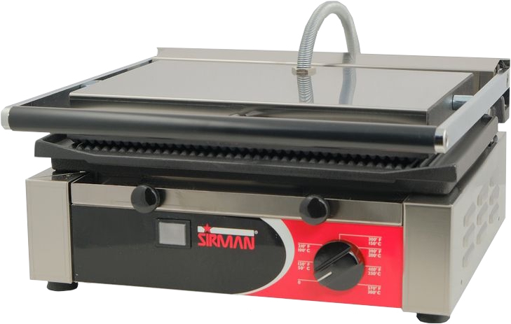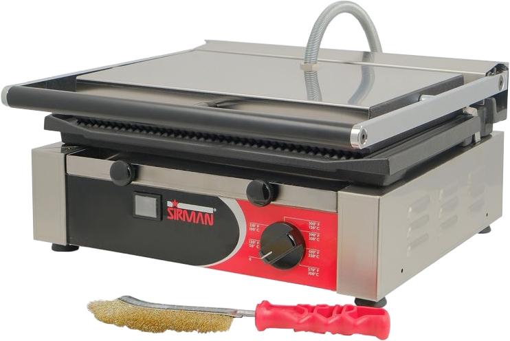 Оснащён терморегулятором, термоизолированной ручкой на верхней панели и «плавающим» креплением, позволяющим подстроиться под толщину продукта. Идеально подходит к применению на предприятиях общественного питания малого и среднего форматов, прежде всего в заведениях типа "фаст-фуд". Корпус изготовлен из нержавеющей стали, рабочие поверхности – из чугуна, пластины – со стеклокерамической обработкой.